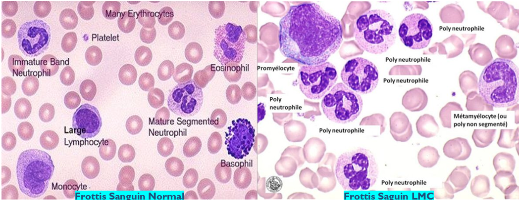 - Une Frottis sanguin : met en évidence la présence de cellules immatures de la lignée myéloïde, une éosinophilie et une basophilie, permettant de différencier la LMC à d’autres causes d’hyperleucocytose.