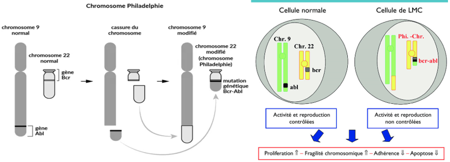 Les principales causes de la leucémie myéloïde chronique (LMC) sont liées à une anomalie chromosomique acquise au cours de la vie, notamment la formation du chromosome de PHILADELPHIE incontrôlée des cellules myéloïdes dans la moelle osseuse. Ce chromosome est le résultat d’une fusion anormale entre des parties des chromosomes 9 et 22, qui crée un gène de fusion BCR-ABL. Ce gène produit une protéine anormale (oncoprotéine BCR-ABL) qui stimule de manière excessive la division des cellules et empêche la mort des cellules cancéreuses, provoquant ainsi une prolifération incontrôlée des cellules myéloïdes dans la moelle osseuse.