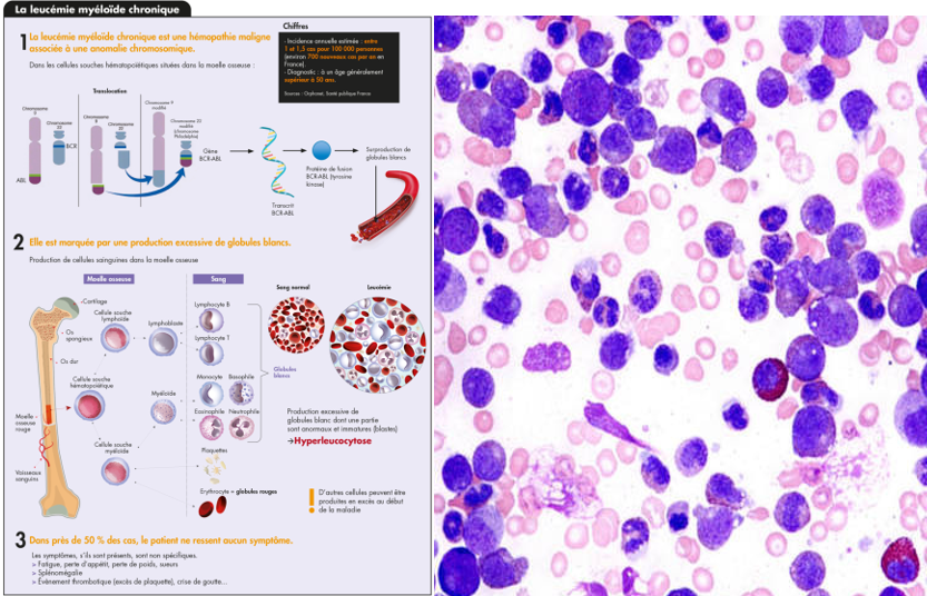 En résumé, la leucémie myéloïde chronique est une maladie hématologique caractérisée par une dérégulation de la production des globules blancs due à une transformation maligne clonale des cellules souches médullaires, avec une évolution le plus souvent lente et un traitement efficace ciblant la cause moléculaire.