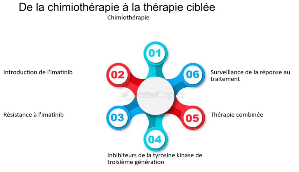 Le traitement principal repose sur des médicaments inhibiteurs de la tyrosine kinase, qui ont considérablement amélioré le pronostic et la survie des patients. D’autres traitements moins fréquents incluent des agents myélosuppresseurs, la transplantation de cellules souches et l’interféron alpha.